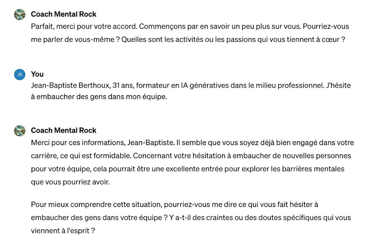 Coach Mental Rock va me poser des questions pour comprendre la peur sous-jacente et m’aider à la surpasser si besoin. L’IA est ici une interface conversationnelle pour me révéler à moi-même.