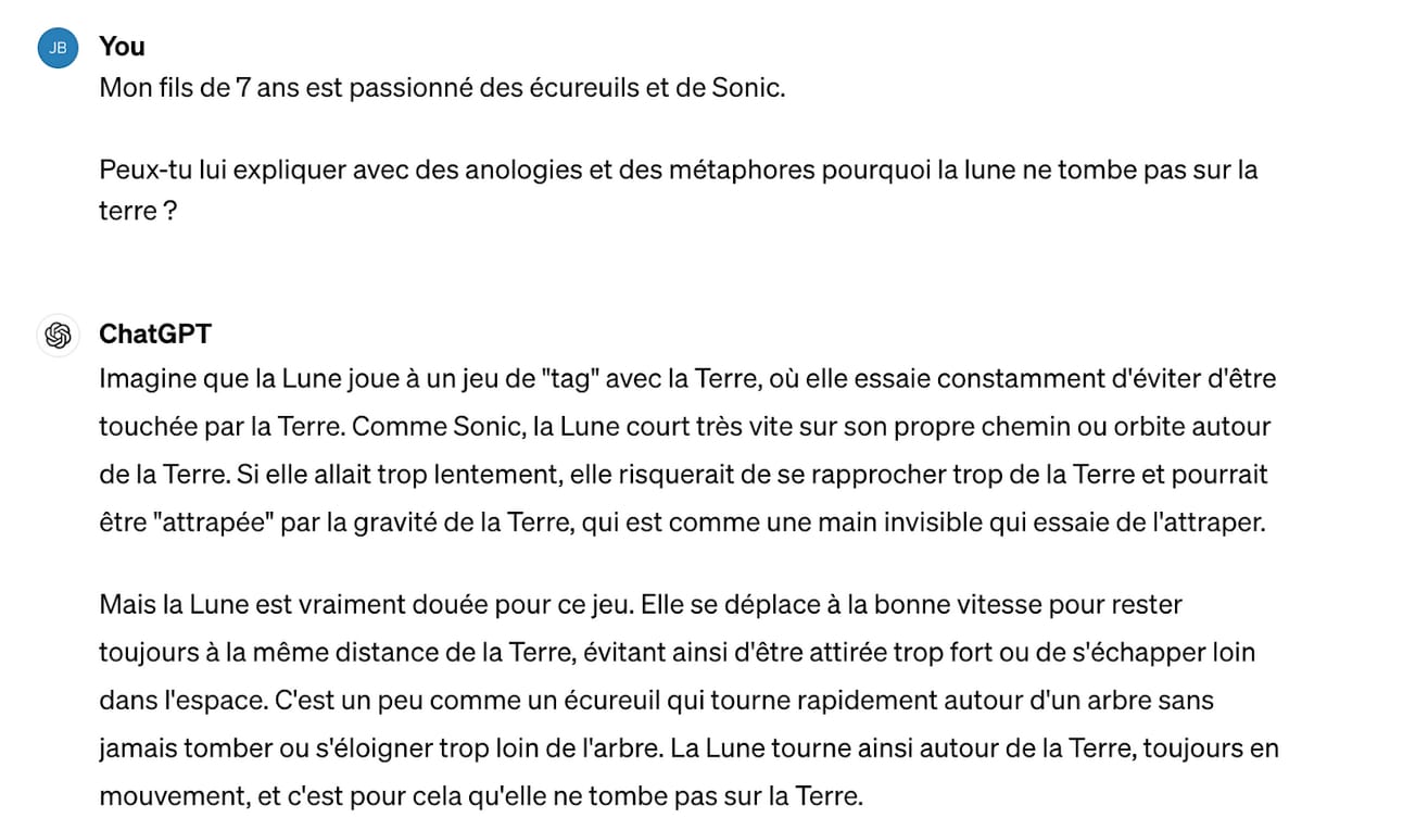 Chat GPT s’adapte au niveau de connaissance d’un interlocuteur et à ses intérêts pour l’aider à mieux comprendre une problématique, utilisant des analogies et des métaphores adaptées.