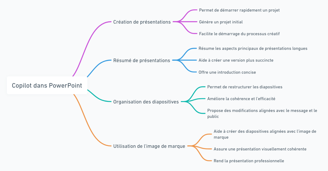 Création de présentations : Copilot permet de démarrer rapidement un projet de présentation en se basant sur une rubrique donnée. Il peut générer un projet initial, facilitant le démarrage du processus créatif.