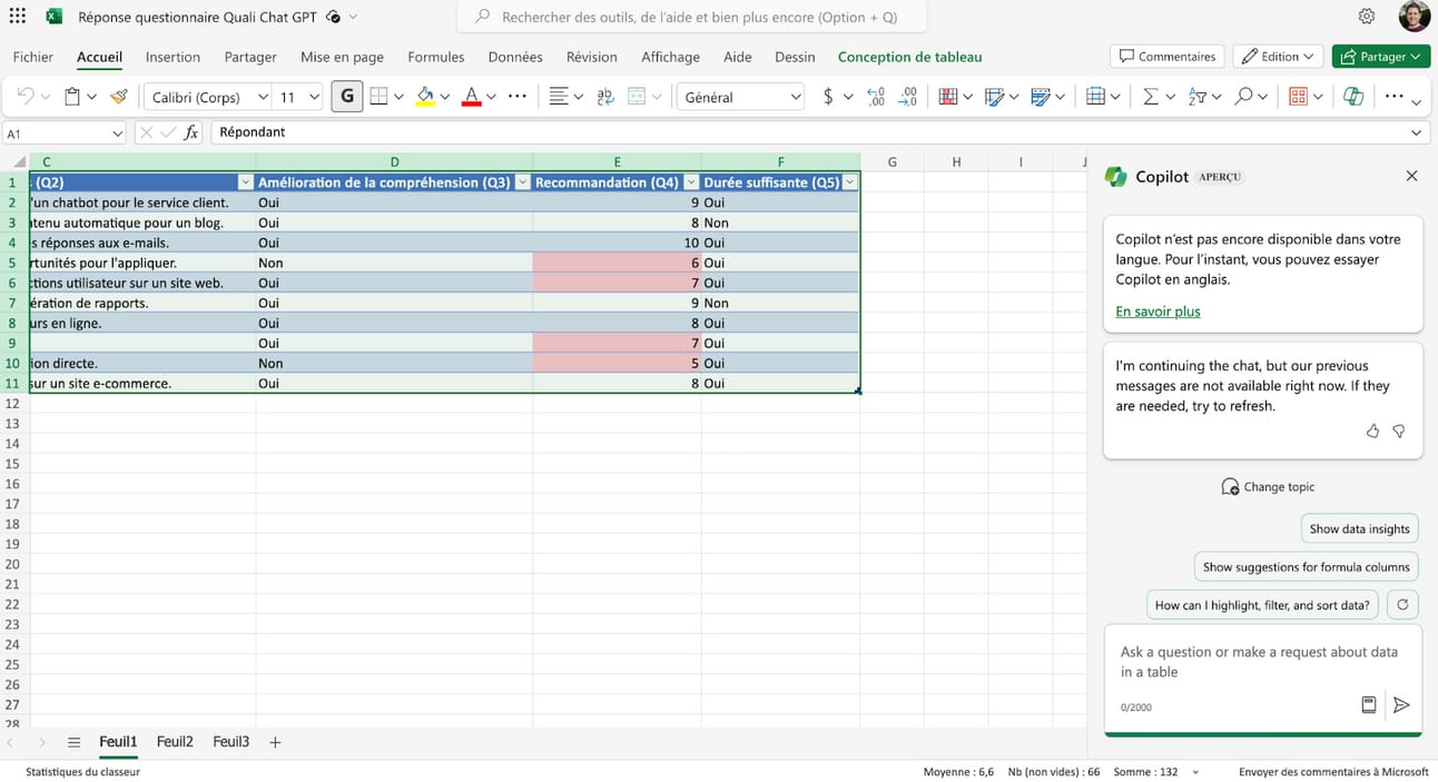 Copilot dans Excel est capable de calculer des moyennes et le pourcentage de oui et de non. Il a surligné en rouge les 4 valeurs les plus hautes d’une colonne et me donne des conseils de formule.