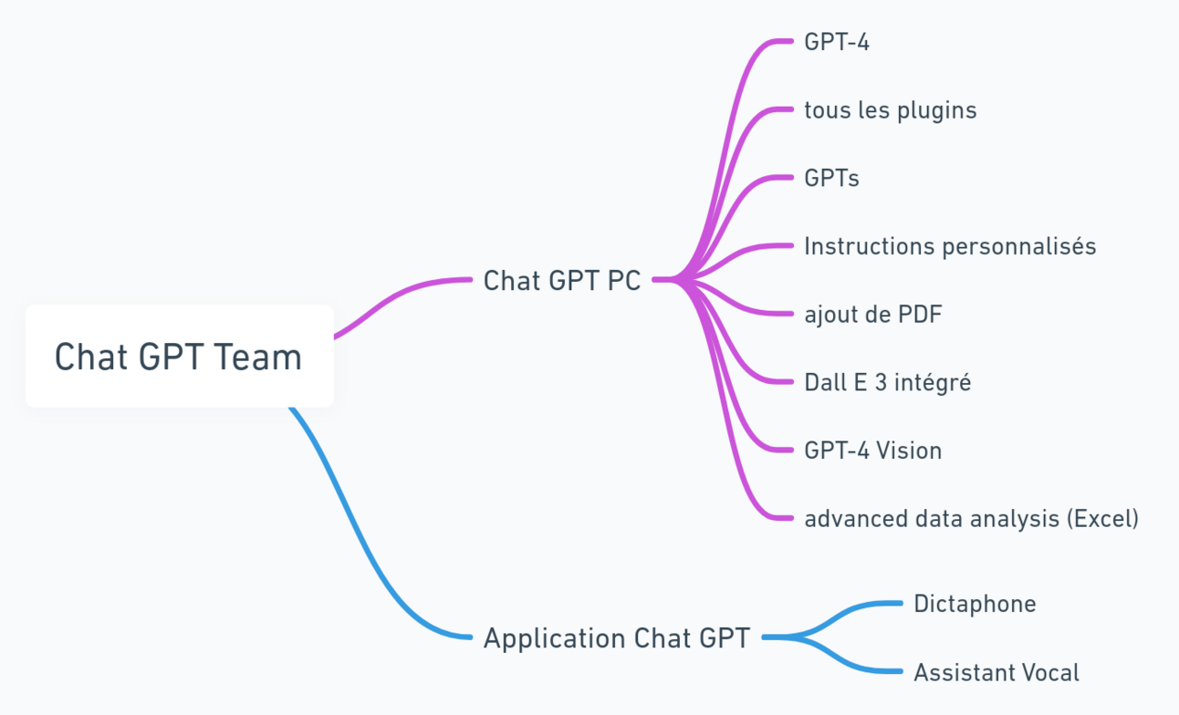 Grâce au plugin Chat GPT, AI diagrams, je vous ai détaillé les principales fonctionnalités de Copilot Pro et de Chat GPT Team