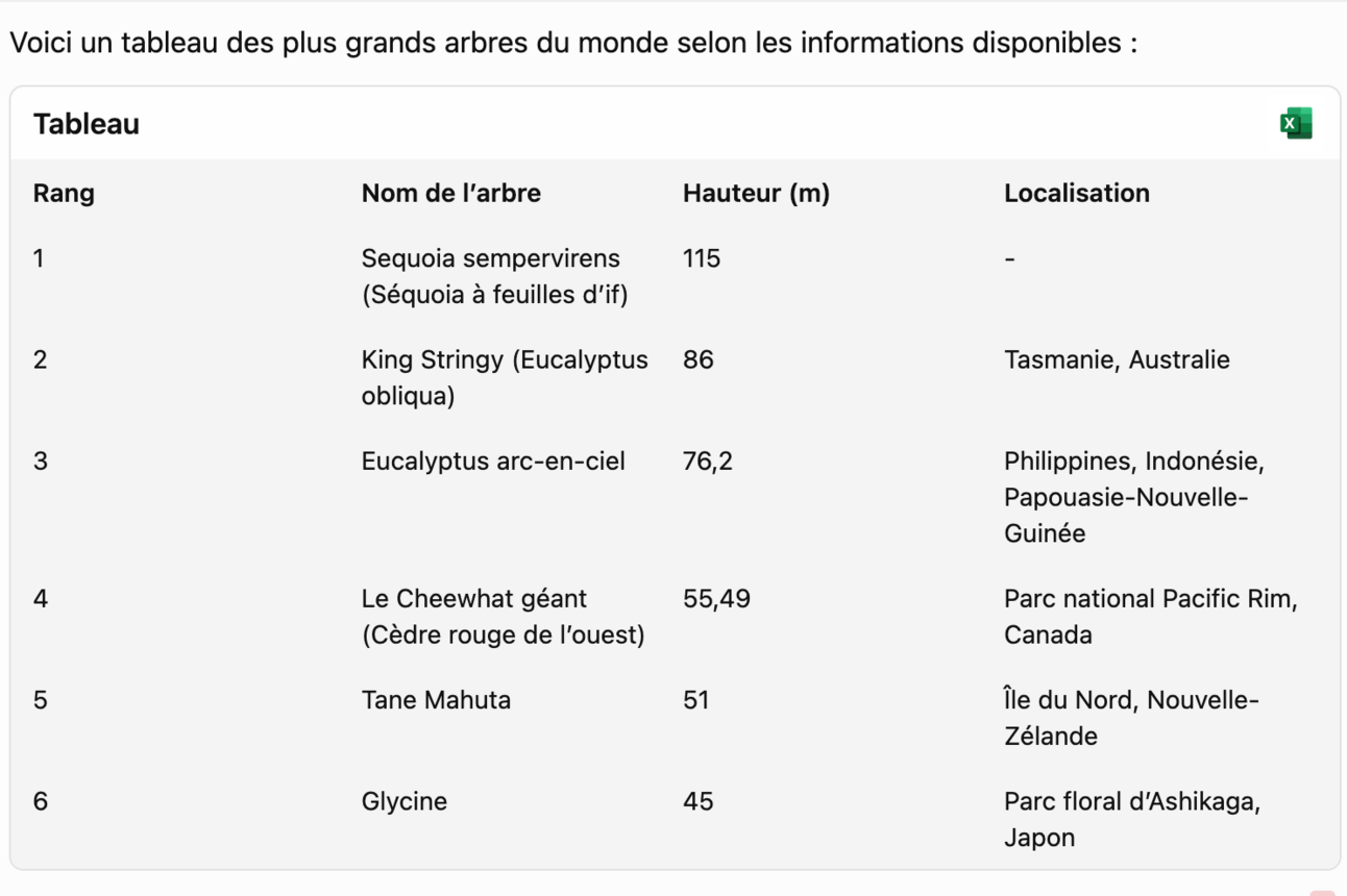 Par exemple, je peux utiliser Copilot Pro Chat et demander de me faire un tableau avec les plus grands arbres du monde.