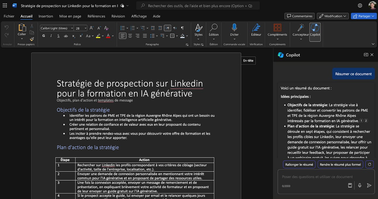 J’ai ensuite demandé à Copilot de me transformer les étapes de la stratégie en tableau. Copilot n’a pas transformé directement le document, j’ai dû copier coller le tableau. J’ai résumé le document puis ai posé une question sur le contenu : “Les messages de prospection sont-ils bons ?”. Puis j’ai demandé comment ajouter une table des matières.