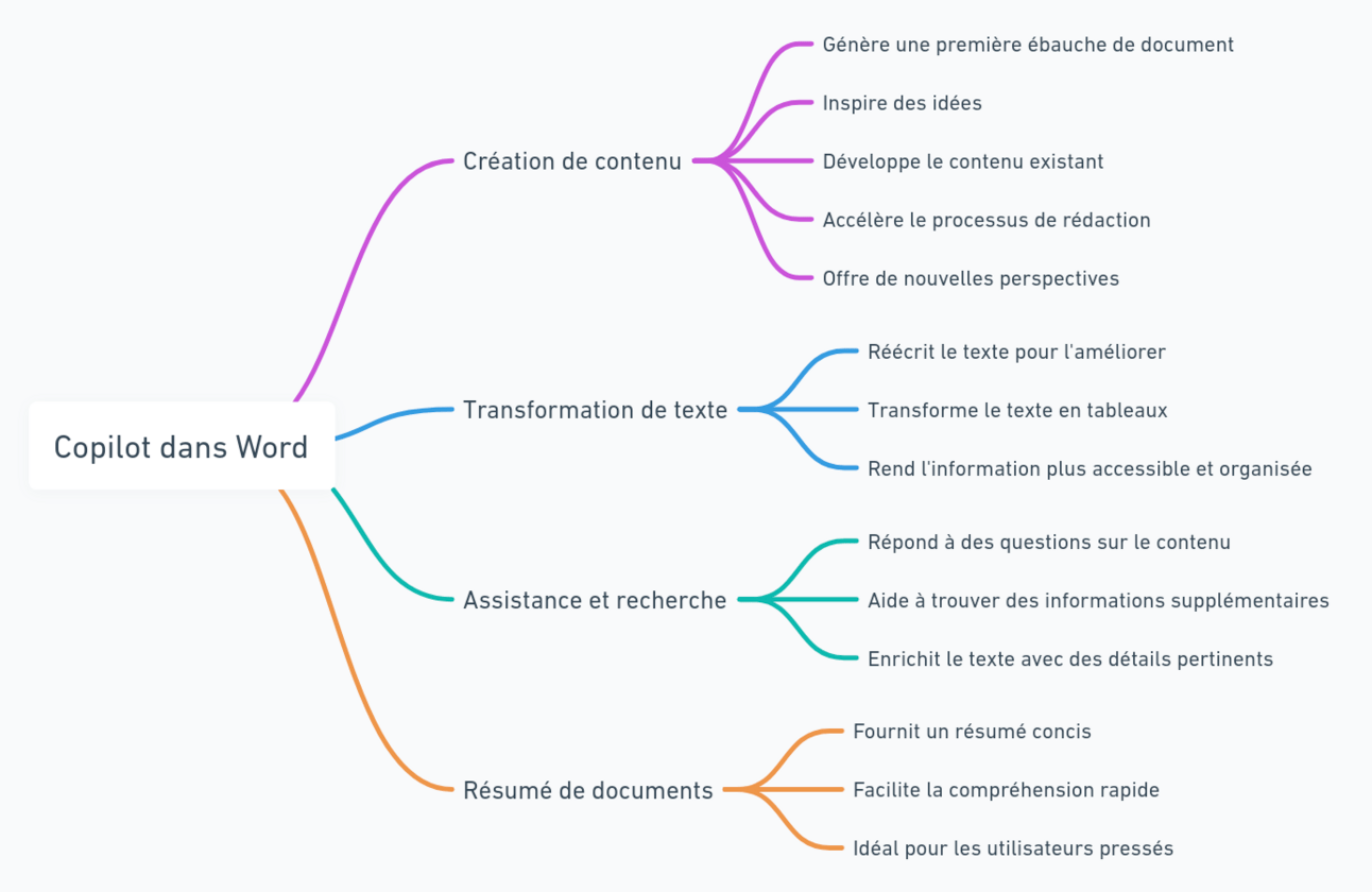Assistance et recherche : Copilot peut répondre à des questions sur le contenu du document, aider à trouver des informations supplémentaires et enrichir le texte avec des détails pertinents.