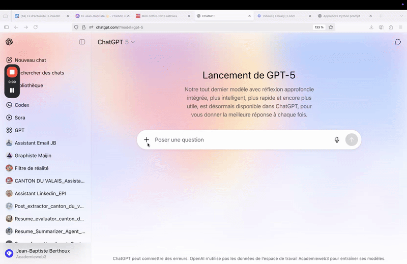 En 1 prompt, il a eu des brouillons de landing page, des publications linkedins, des prévisions financières. En tant que prof et ex-entrepreneur, il a trouvé les réponses de GPT-5 trés qualitatives. Une équipe de MBA aurait mis quelques heures à le réaliser.