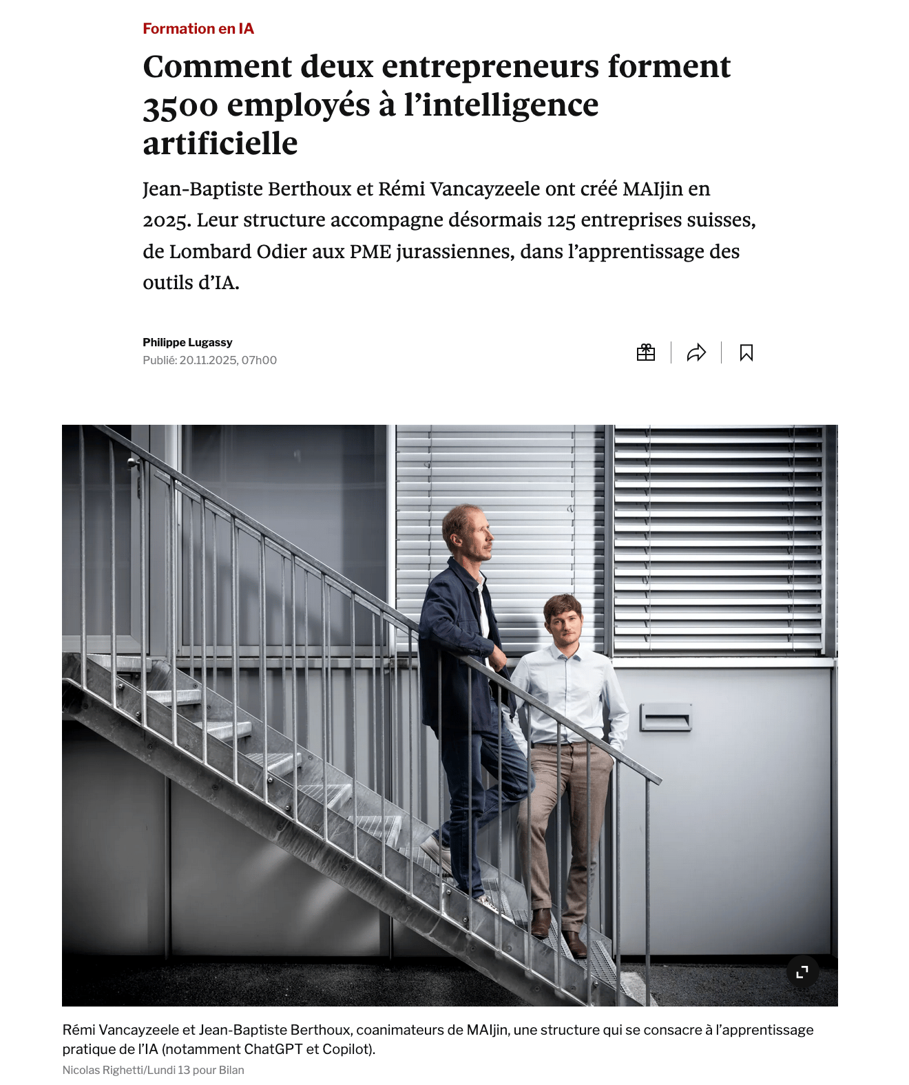 En attendant, GRANDE NOUVELLE : Maijin a fait la une du journal numérique de Bilan.ch. Une grosse récompense pour moi qui travaille d’arrarche pieds pour vulgariser et simplifier l’IA en entreprise depuis Janvier 2023. Une grosse récompense pour Rémi, qui m’a rejoint en Septembre 2024 et travaille comme un fou pour rendre nos clients satisfaits et plus efficaces 🙂