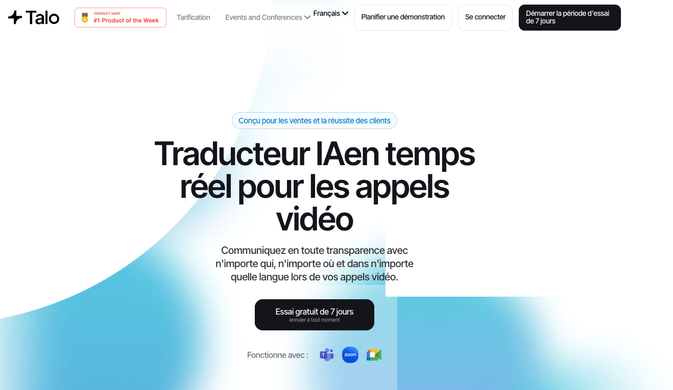 Talo est un bot que vous invitez dans votre réunion Zoom, Teams ou Google Meet et qui traduit en temps réel ce que dit votre interlocuteur. Une cliente de la RTS m’a exposé sa problématique : comprendre des réunions en allemand alors qu’elle ne parle pas la langue. Talo résout ce problème. Si vous êtes dans une entreprise internationale ou que vous souhaitez exporter vos services, ce logiciel pourrait vous aider. Il a été dans le top3 des produits du mois sur ProductHunt.