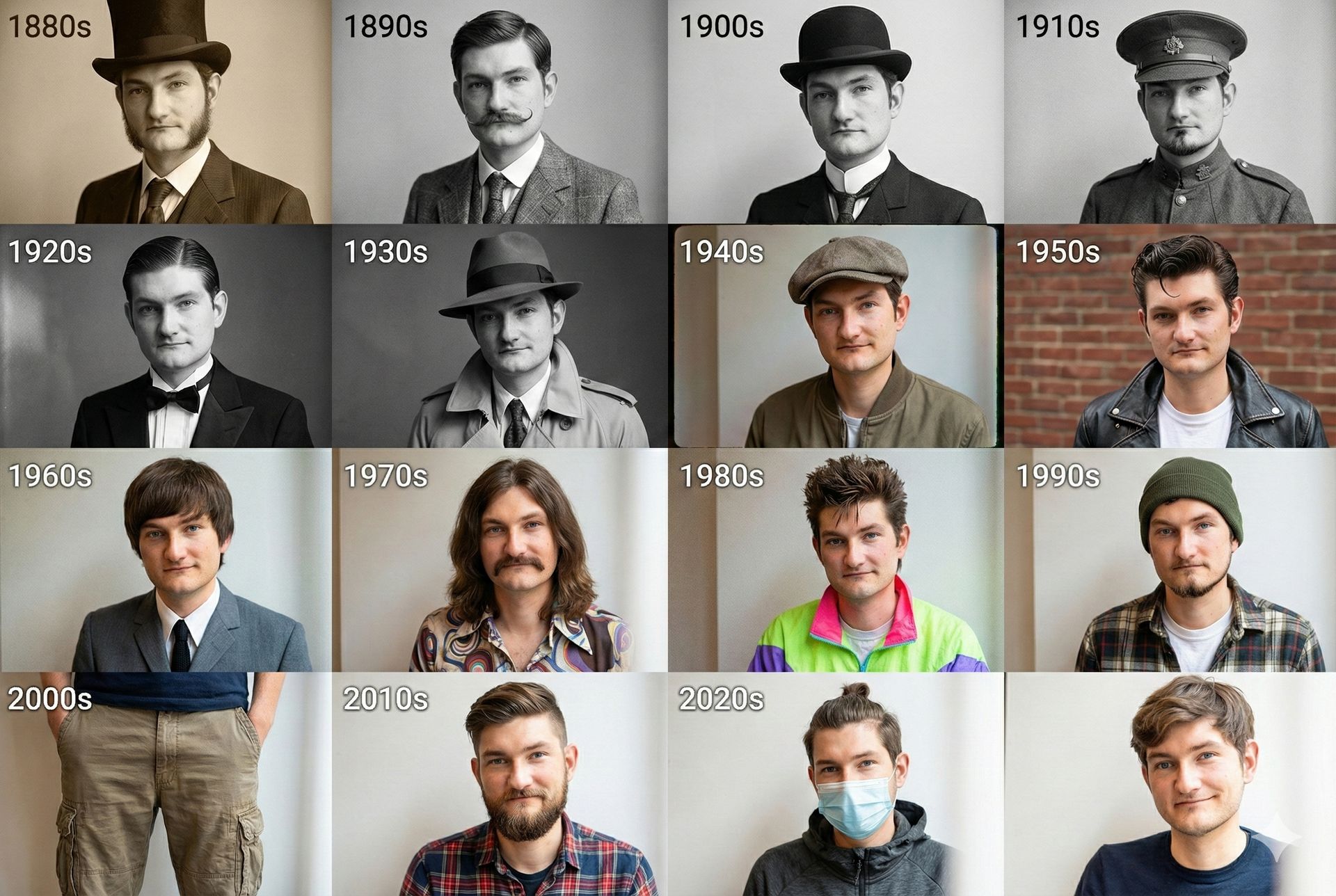Make a 4×4 grid startingwith the 1880s, until 2020's. In each section, I should appear styled