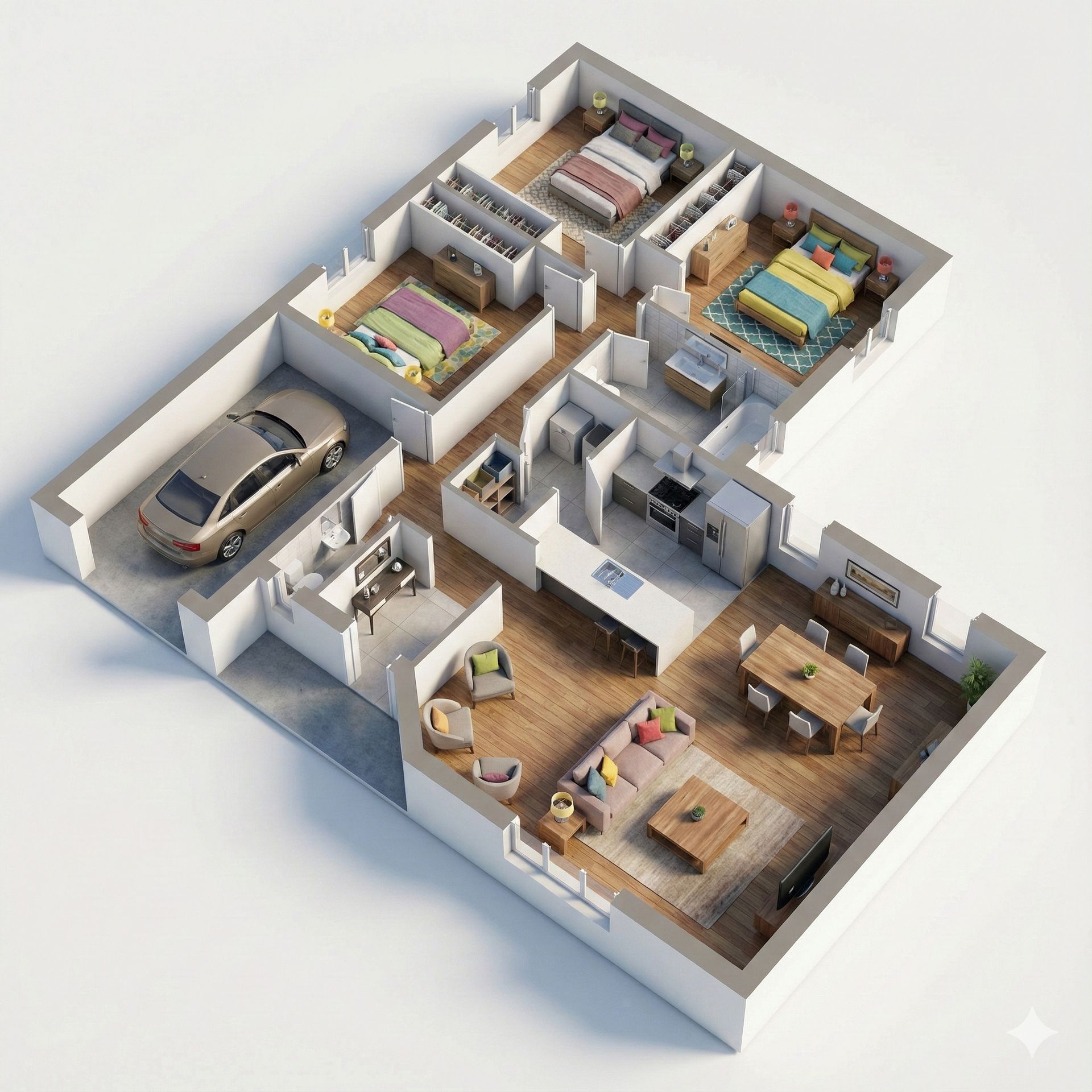 Top-down, fully 3D isometric render of the entire floor plan. Create a clean, highly detailed miniature architectural maquette with accurate room proportions and layout, matching the reference exactly. Remove all text labels. Keep all walls, doors, furnitures, appliances or rooms properly places Use colorful, modern furniture and decorative objects in each room—sofas, beds, tables, cabinets, lamps, plants, rugs, appliances—arranged realistically and in scale. High-resolution, photorealistic materials (wood floors, tiles, fabrics, glass). Soft global lighting, subtle shadows, crisp edges. Professional, polished, high-quality outputEtape 2 : Attendez le résultat