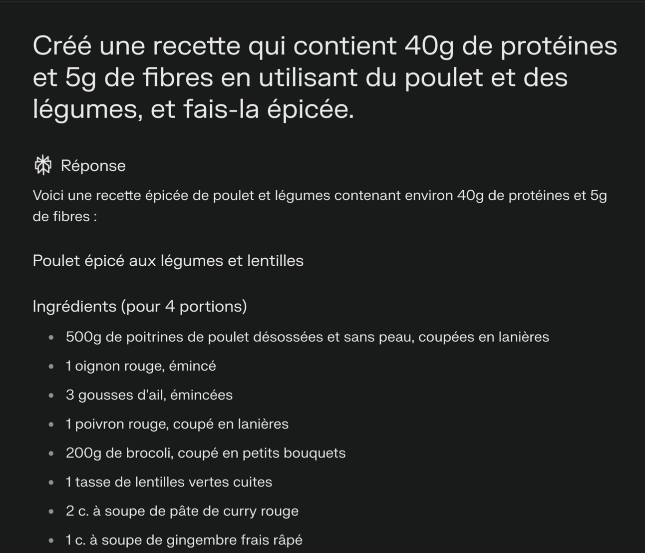 Vous cherchez une recette de cuisine équilibrée et savoureuse à base de poulet et légumes ? Perplexity vous suggérera la combinaison d’ingrédients optimale.